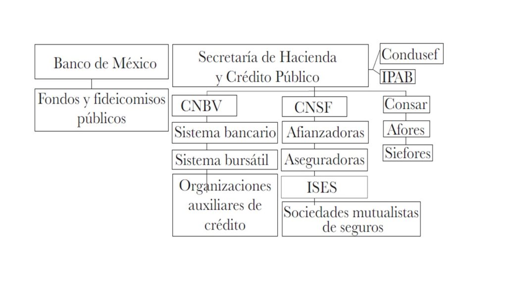 En el siguiente link se puede consultar el organigrama completo del sistema financiero mexicano: chrome-extension://efaidnbmnnnibpcajpcglclefindmkaj/https://www.gob.mx/cms/uploads/attachment/file/23187/Estructura_del_Sistema_Financiero_Mexicano_2015.pdf
