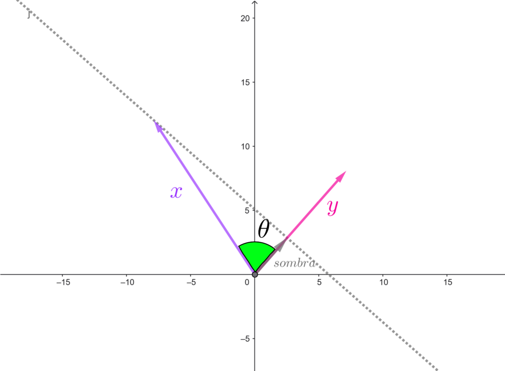 Las propiedades trigonométricas nos dicen que si proyectamos el vector $x$ en el vector $y,$ el valor de $cos \theta \norm{\vphantom{y}x}_2$ coincide con la norma del vector que genera la «sombra» de la proyección. Nota que el «tamaño» de esa sombra es menor igual que el tamaño del vector proyectado (la norma de $x$), por lo tanto se verifica que: