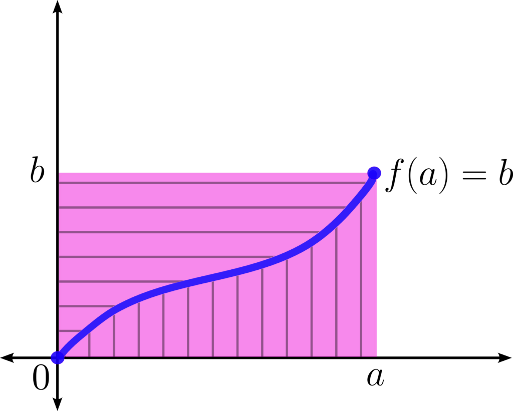 La función restringida $f_{[0,a]}: [0,a] \to [0,b]$ es biyectiva. El área del rectángulo es $ab$ y esto es igual al área bajo la curva de $f$ en $[a,b]$ más el área bajo la curva de la función inversa $f^{-1}$ (que es el área entre la curva y el eje vertical).