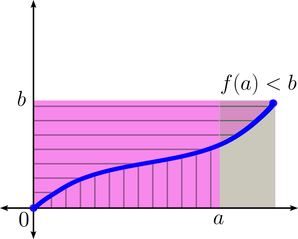 Ahora considera una función continua y creciente $f: [0, \infty) \to \mathbb{R}$ tal que $f(0) = 0$ y con $[0,b]$ contenido en la imagen de $f.$ Nota que $f$ es una función inyectiva en $[0, \infty]$ y tiene inversa, cuando menos en los siguientes casos: