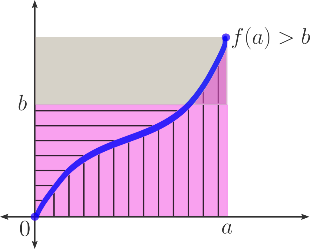 La función restringida $f_{[0,f^{-1}(b)]}: [0,f^{-1}(b)] \to [0,b]$ es biyectiva. En este caso, el área del rectángulo queda contenida en el área bajo la curva en el intervalo $[0,a]$ (en el eje horizontal) y el área entre la curva y el intervalo $[0,b]$ en el eje vertical.