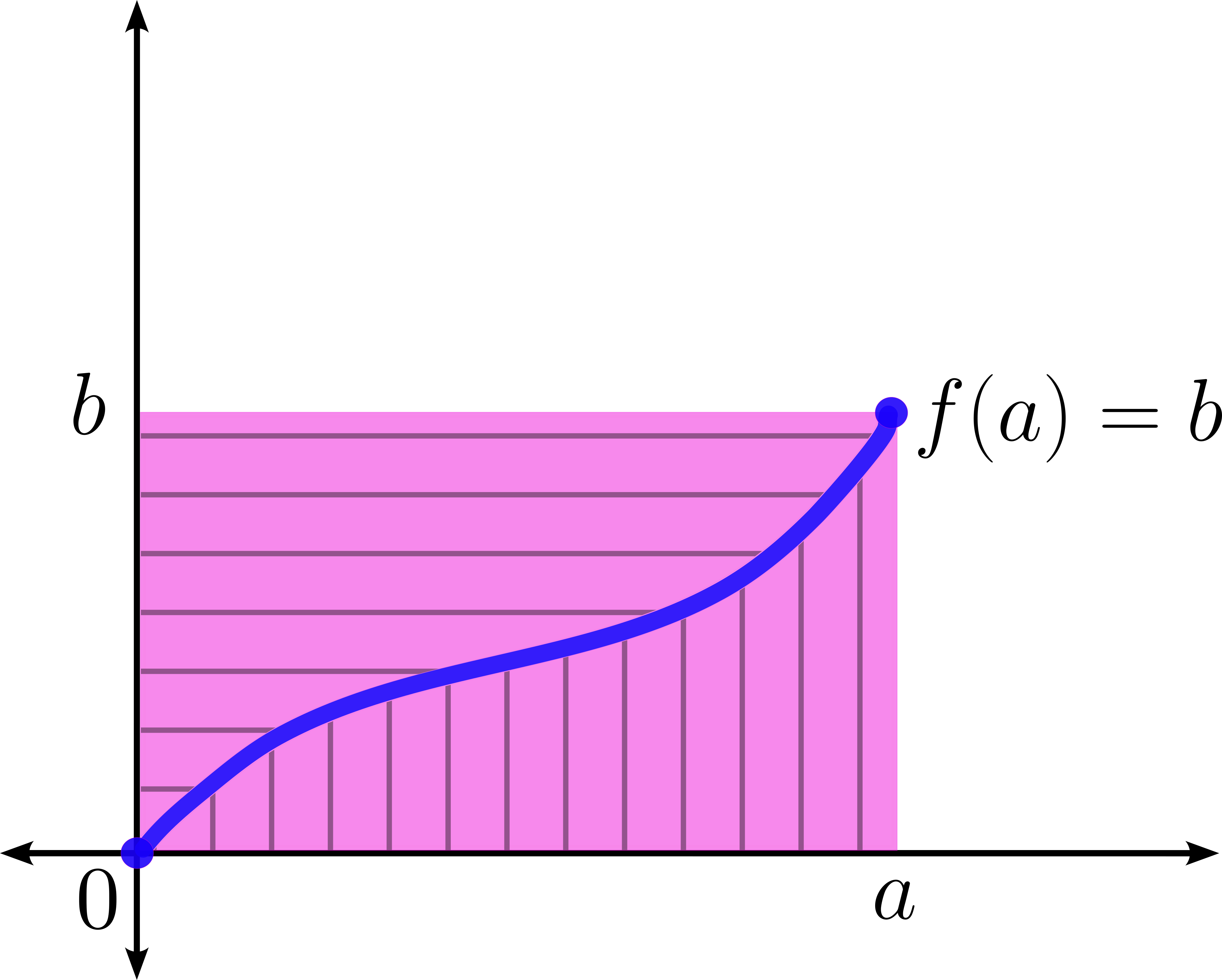 La función restringida $f_{[0,a]}: [0,a] \to [0,b]$ es biyectiva. El área del rectángulo es $ab$ y esto es igual al área bajo la curva de $f$ en $[a,b]$ más el área bajo la curva de la función inversa $f^{-1}$ (que es el área entre la curva y el eje vertical).