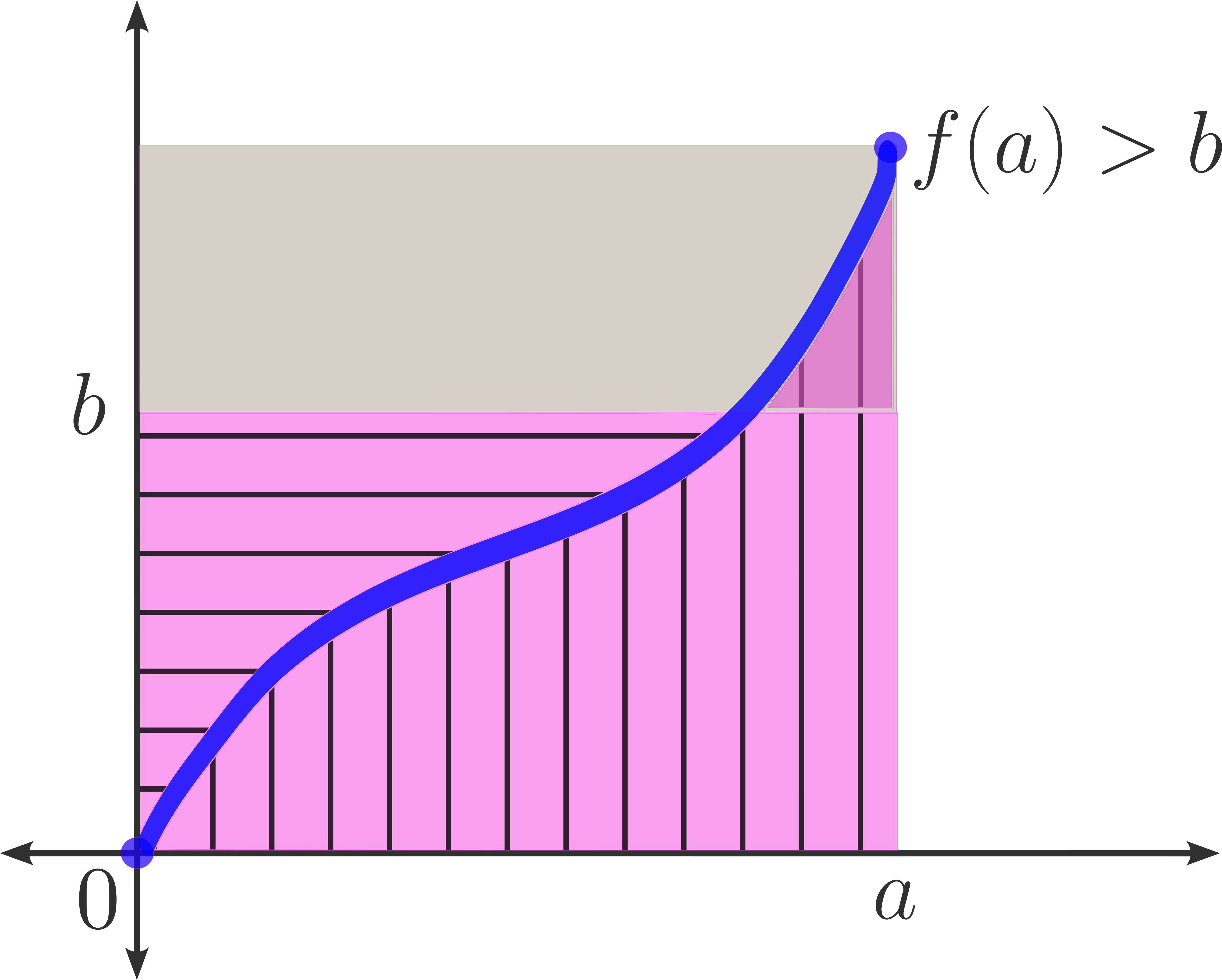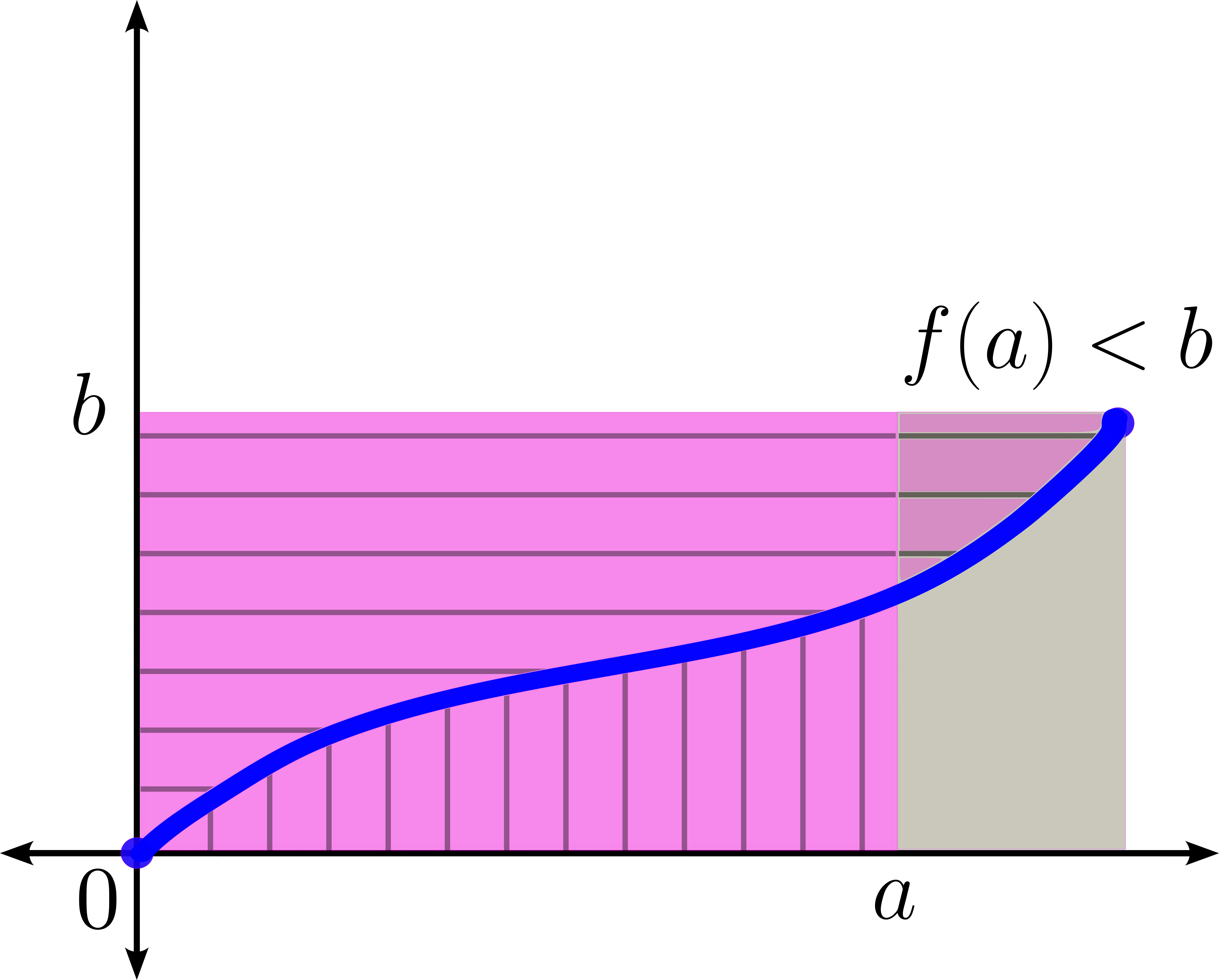 La función restringida $f_{[0,f^{-1}(b)]}: [0,f^{-1}(b)] \to [0,b]$ es biyectiva. En este caso, el área del rectángulo queda contenida en el área bajo la curva en el intervalo $[0,a]$ (en el eje horizontal) y el área entre la curva y el intervalo $[0,b]$ en el eje vertical.