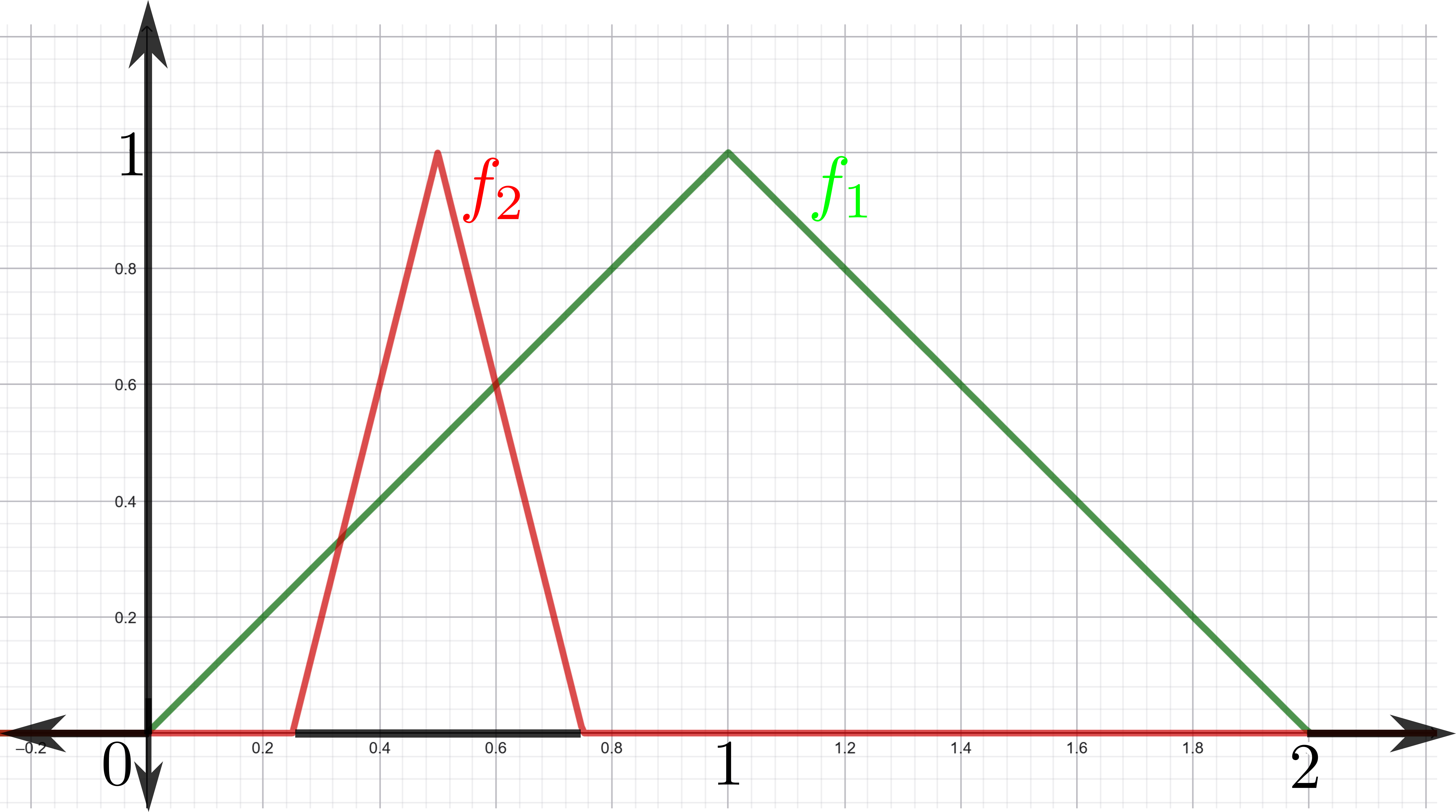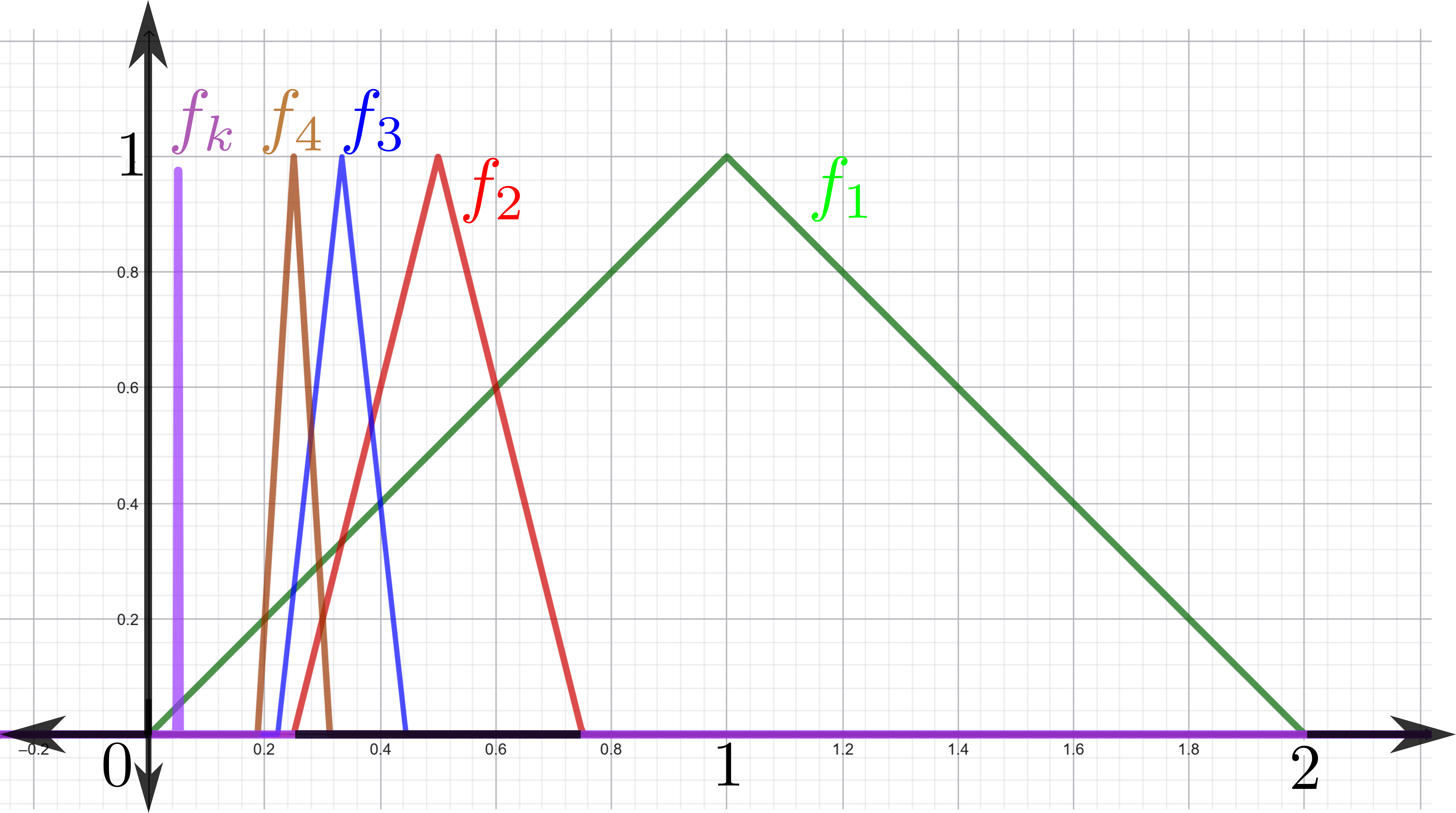 La familia de funciones $\mathcal{H}:= \{f_i \, | \, i \in \mathbb{N}\}$ no es compacta en el espacio $\mathcal{C}^0[0,2]$ porque no es totalmente acotada: Es sencillo ver que para cualesquiera dos funciones $f_l, f_m \in \mathcal{H}$ con $l \neq m,$ se cumple que $d_{\infty}(f_l,f_m)=1.$ De modo que no es posible cubrir $\mathcal{H}$ con una cantidad finita de bolas abiertas de radio $\frac{1}{2}.$ Esto se debe a que cualquier bola abierta $B(f, \frac{1}{2}) \subset \mathcal{C}^0[0,2]$ tiene a lo más un elemento de $\mathcal{H}:$ Si $f_l, f_m \in B(f, \frac{1}{2})$ se cumple que $d_{\infty}(f_l,f_m) \leq d_{\infty}(f_l,f)+d_{\infty}(f,f_m) < \frac{1}{2}+\frac{1}{2}= 1$ lo cual es una contradicción a la distancia entre ambas funciones. En consecuencia no será posible cubrir todos los elementos de $\mathcal{H}$ con una cantidad finita de bolas por lo que $\mathcal{H}$ no será totalmente acotado.