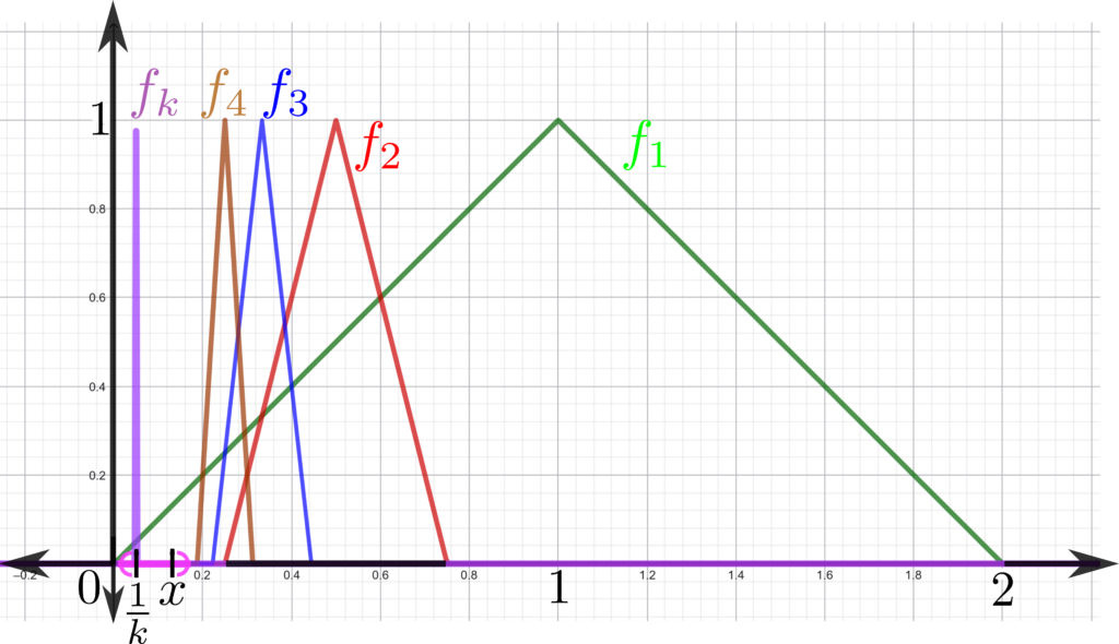 f_n(x):=\begin{cases} 1 -n^2|x-\frac{1}{n}|, \, &\text{si $|x-\frac{1}{n}|<\frac{1}{n^2}$}\\