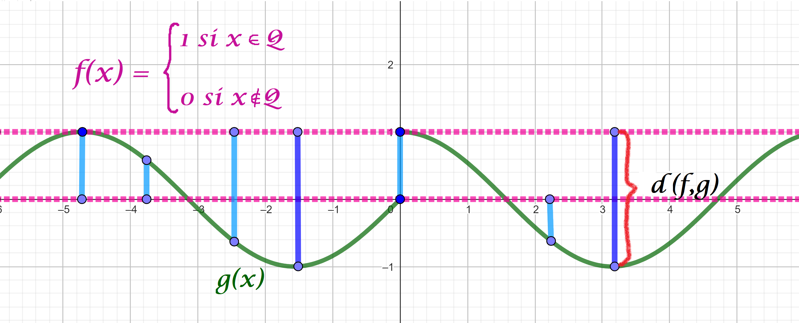 La siguiente imagen representa la distancia entre dos funciones acotadas $f$ y $g.$ Como ejemplo, la función $f$ es la función de Dirichlet, que vale $1$ si se evalúa en los racionales ($\mathbb{Q}$) y vale $0$ en caso contrario.