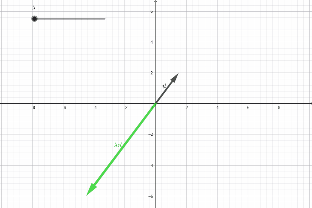 El segundo axioma habla del producto de un vector por un escalar. Sea $\vec{u}$ un vector en $\mathbb{R}^2,$ la igualdad $\|\lambda \vec{u}\| = |\lambda| \|\vec{u}\|$ indica que el tamaño de la flecha de $\vec{u}$ cambia en proporción con el valor de $\lambda.$ En el siguiente gráfico, el vector en verde, muestra a $\, \vec{u} \,$ luego de ser multiplicado por un escalar en el intervalo $(-3,3).$