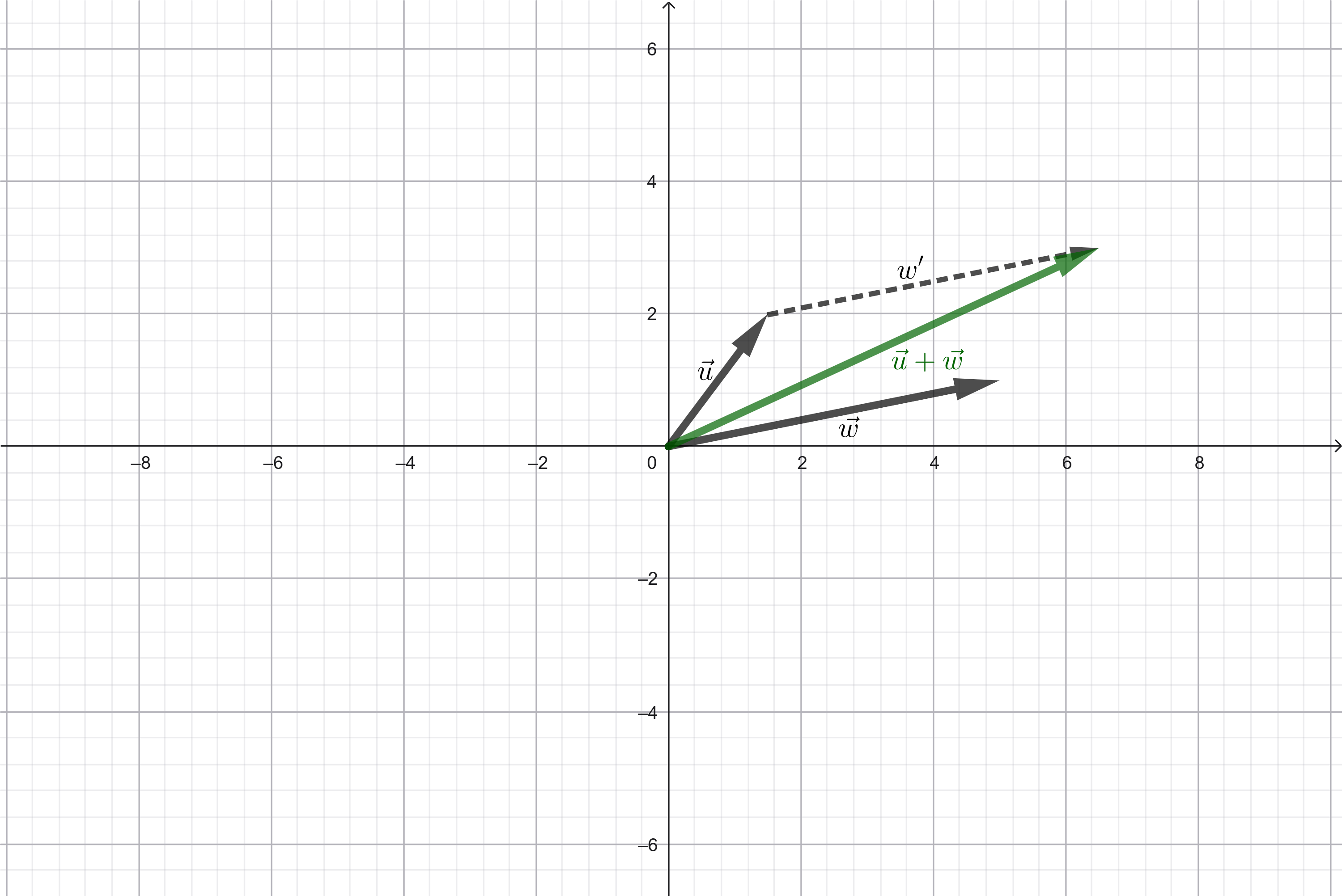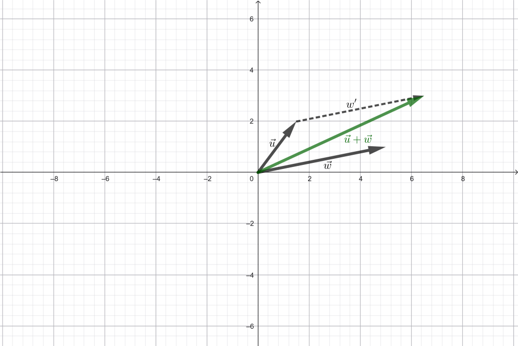 El tercer axioma dice que la norma de la suma de dos vectores es menor igual que la suma de la norma de cada uno. La siguiente imagen visualiza que, si $\vec{u}$ y $\vec{w}$ son vectores en $\mathbb{R}^2,$ la magnitud de la flecha que representa $\vec{u}+\vec{w}$ es menor igual que la suma de las magnitudes de las flechas de $\vec{u}$ y $\vec{w}.$ Esta propiedad, en el caso de las normas, también se conoce como desigualdad del triángulo.