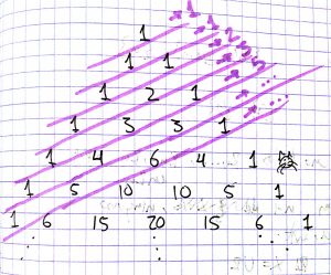 En esta entrada quiero dar dos demostraciones de un hecho sensacional: si se suman los números que están en las diagonales del triángulo de Pascal, entonces se van obteniendo los números de Fibonacci. Esto se ve más claro en la siguiente imagen. Cada diagonal es lo que está entre dos líneas rosas (¿moradas?). Arriba a la derecha están las sumas.