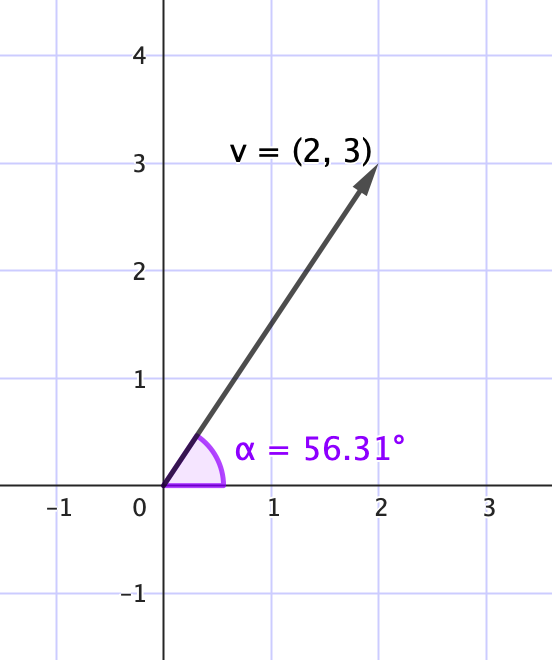 El ángulo de apertura ($\alpha = 56.31^\circ$) indica la dirección del vector respecto al eje horizontal.