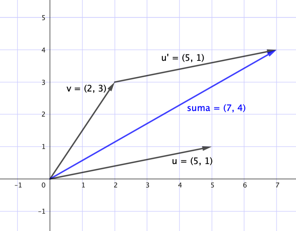 La suma de dos vectores $\mathbf{u}, \mathbf{v} \in \mathbb{R}^n$ se define por la operación componente a componente