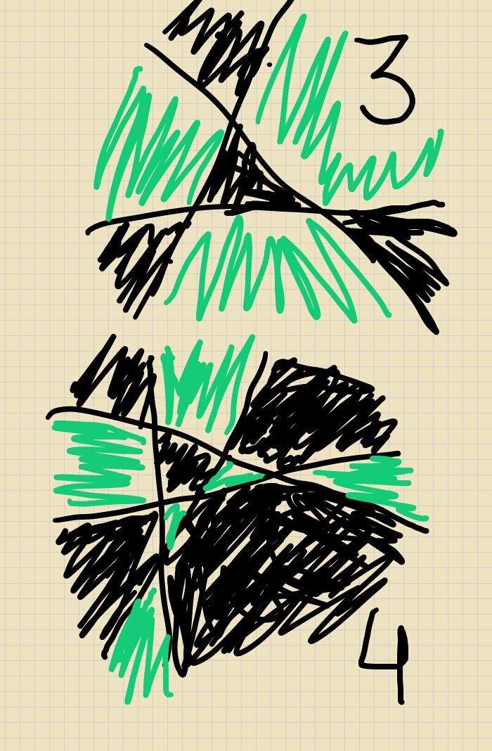 Hagamos la Parte A. Supongamos que $n$ es impar y que tenemos los segmentos como en el problema (se intersectan de dos en dos, pero no hay tres por el mismo punto). Extendamos los segmentos a rectas por todo el plano. Por la sección anterior, podemos colorear las regiones con verde y negro sin regiones del mismo color adyacentes.