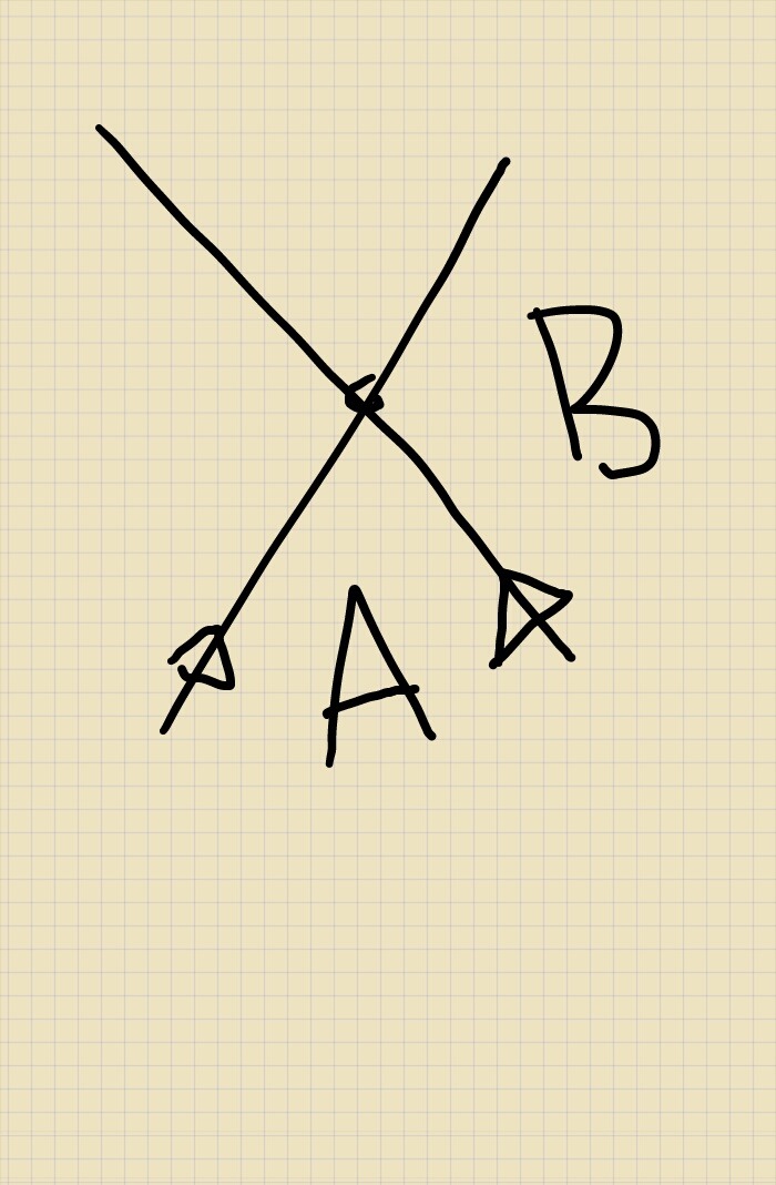 Si las ranas llegan al punto de intersección al mismo tiempo, entonces las regiones $A$ y $B$ serían del mismo color por la observación anterior. Pero esto sería una contradicción a la manera en la que coloreamos el plano, la cual garantiza que $A$ y $B$ tienen distinto color pues son adyacentes. Entonces las ranas nunca coinciden, y esto termina la prueba.